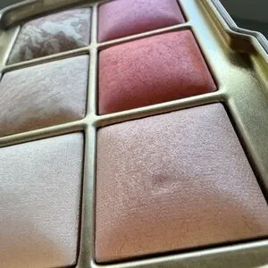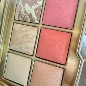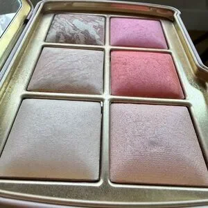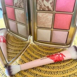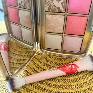 Like new. Used once. No box. Slight indentation on one highlighter. Brush and palette in the deer design. Smoke free home. Hourglass collectible compact featuring stylized deer and floral artwork. Includes coordinating double-ended brush with floral motif and soft bristles. Elegant gold Hourglass logo on compact.
