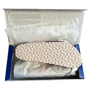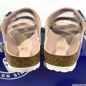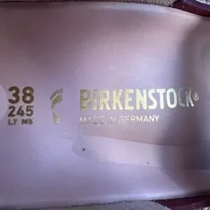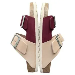 Classic two-strap Birkenstock sandals. Features adjustable buckles. Soft beige footbed and cork sole. Burgundy straps add a bold look. Comfortable contoured footbed for all-day wear. Worn a few times, but I need the next size up for better comfort.