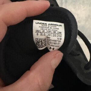 Under Armour branded sneakers in black. Mesh and fabric upper. Lace-up design with logo on tongue. Padded collar for comfort. Versatile for gym or casual wear. In good used condition, some signs of wear!