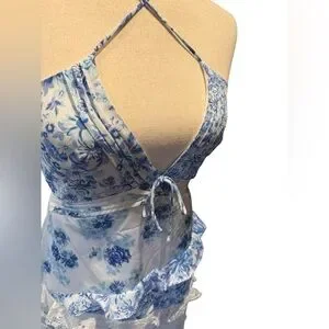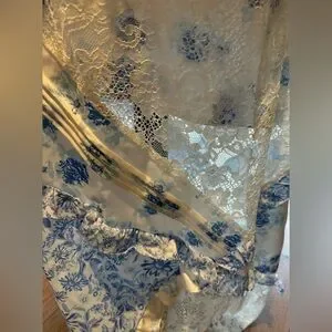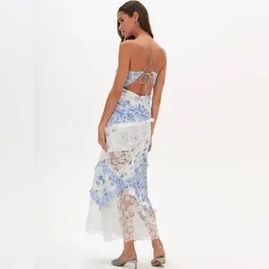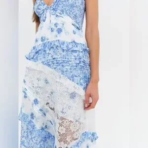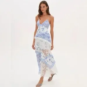 Our bestselling maxi dress silhouette is back in blue floral print. Inspired by '70s dresses, the Rosalyn patchwork dress has a plunging neckline and features mixed print paneling and floral lace with ruffle details throughout.
