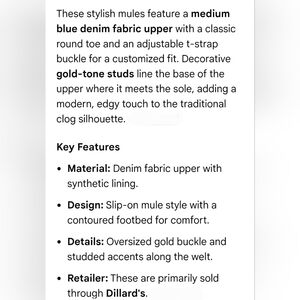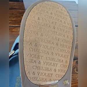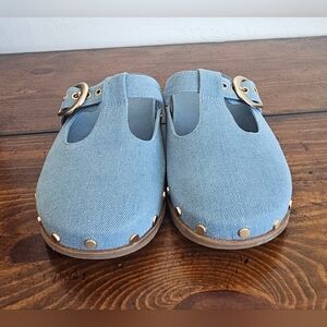 Chelsea & Violet denim blue clogs with gold accent adjustable buckles & studs. Easy slip-on style. Ideal for everyday wear. Super cute. This was a display so the Chelsea & Violet label on the bottom of the heel area is wearing off in places. Please see photos. Price is reflected.