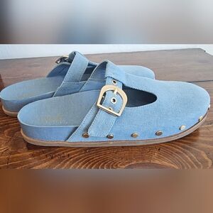 Chelsea & Violet Denim Blue Clogs/Mules W/Gold Buckles. Women's Size 9 NWOB