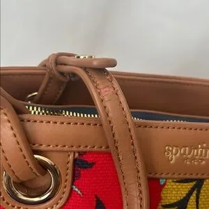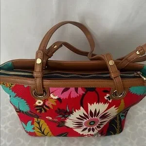 Chic Spartina 449 tote with vibrant floral patterns. Red canvas base with brown leather handles and trim. Perfect for everyday use.