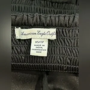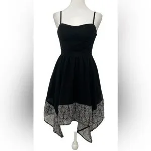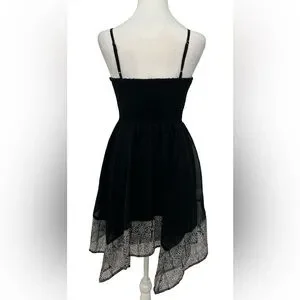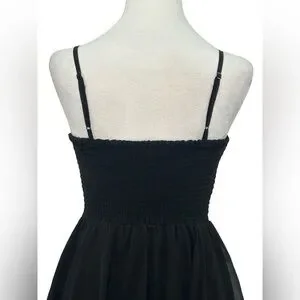 Beautiful American Eagle Outfitters black chiffon dress featuring a flattering fitted bodice and flowing skirt. The dress has adjustable spaghetti straps, a smocked elastic back for comfort, and a unique handkerchief hemline with a delicate printed border that gives it a soft boho look.