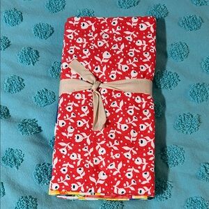Vibrant kitchen towels with floral patterns. Features red, blue, and yellow designs. Ideal for brightening up your kitchen space.18” x 28”