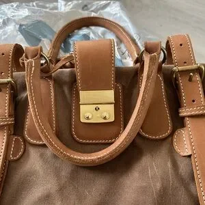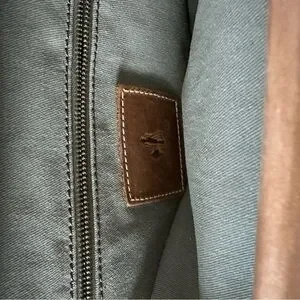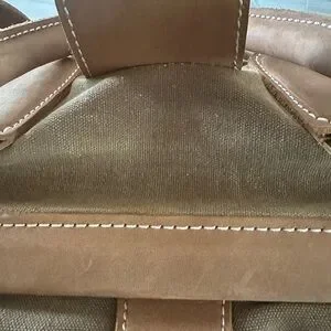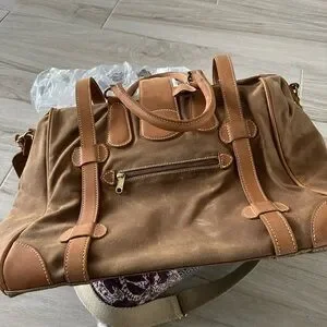 This travel bag is rugged but has good bones. Check out the round leather handels, the shoulder strap, the locking front flap hardware, the leather straps, the leather ID tag, the hardware on the bottom, the inside. Sort of western looking. This bag can be yours!!!!