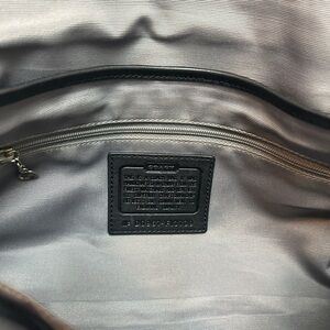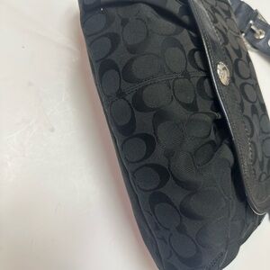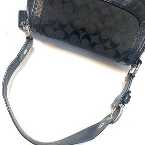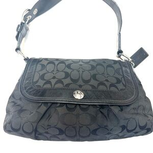 Coach shoulder bag with signature C monogram. Black fabric with leather trim and flap closure. Polished metal logo turn-lock detail. Sleek silhouette for daily or evening use.