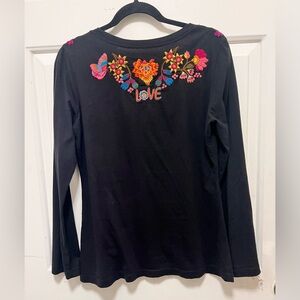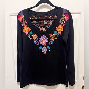 Johnny Was Black Embroidered Scoop Neck Long Sleeve Top Size M