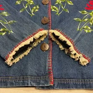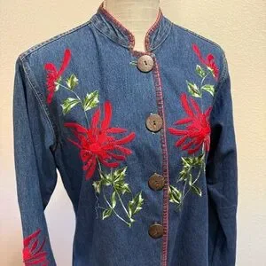 Dark blue denim jacket with bold red floral embroidery and green leaf detailing. Wooden-look button closure down the front. Mandarin collar and subtle red topstitching. Stylish and unique embroidered design.