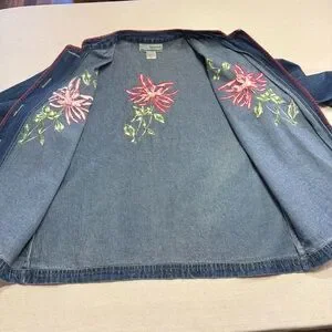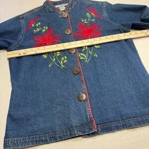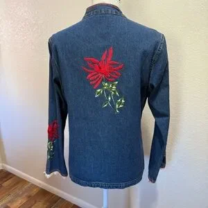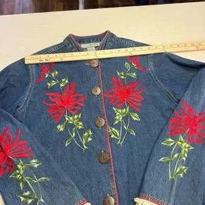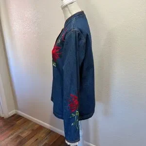 Carrie Allen - Embroidered Denim Jacket with Red Floral Accents - Size Large