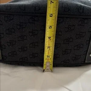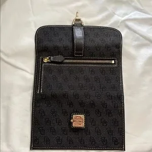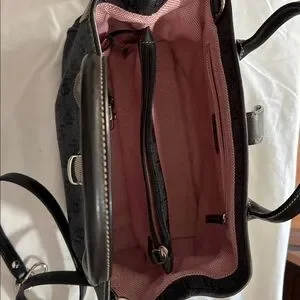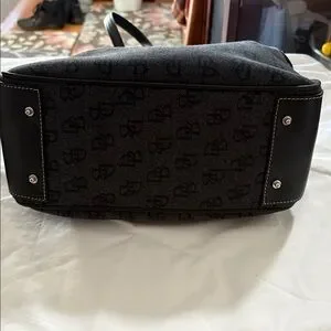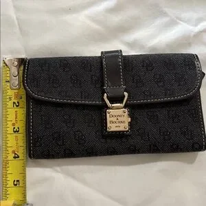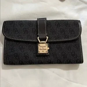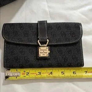 Dooney & Bourke satchel in black logo jacquard. Includes matching wallet and detachable adjustable shoulder strap. Leather trim and contrast stitching. Silver-tone hardware accents on the purse but the wallet has gold-tone accents. Structured, everyday silhouette with organized pockets. Both pieces are in beautiful condition.
