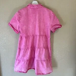 Pink Denim Button-Up Casual Dress Size L Collared Babydoll