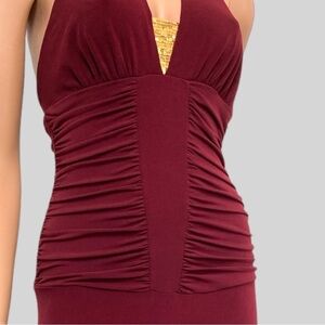 Step into your main character moment with this fairygrunge vintage halter midi dress in a rich burgundy hue. The deep plunge neckline and dramatic open back create an effortlessly bold silhouette, while the scrunchy ruched bodice cinches in all the right places. A soft jersey knit drapes beautifully into a flowy handkerchief hem that sways with every step. A subtle gold sequin insert at the bust adds just the right touch of sparkle.