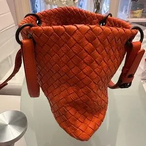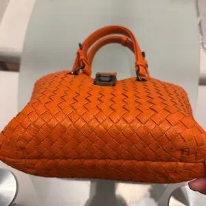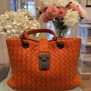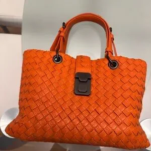 Iconic woven leather tote in vivid orange. Top handle for easy carry. Front clasp closure for security. Soft structured silhouette for daily use. Clean, modern finish. The bag is flat. I put the bag insert. The bag insert is not included.