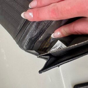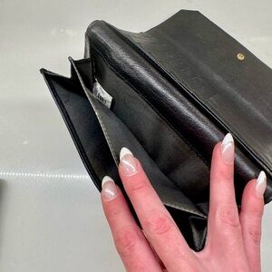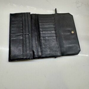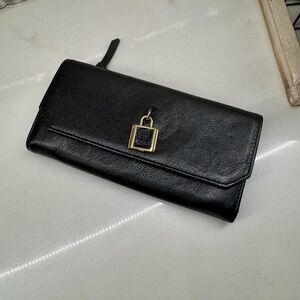 Sleek and stylish black leather wallet with a secure lock detail. Perfect for organizing your essentials! It is in excellent condition.