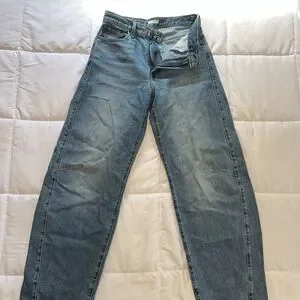 Comfortable women’s blue jeans with a fit top and wide barrel leg design. Durable denim designed for everyday wear. Features traditional five-pocket styling and a versatile blue wash. Cinch buttons on back. Easy to pair with casual and layered outfits.