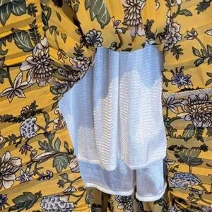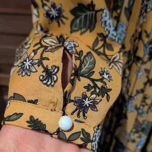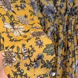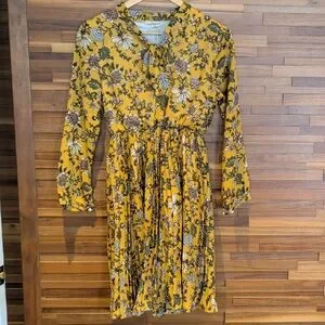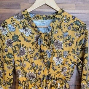 Elegant mustard yellow long sleeve midi dress with an all-over floral print. Features a gathered waist and button-front detail for a flattering silhouette. Lightweight and comfortable for everyday wear or casual outings. Includes long sleeves and a feminine, flowy skirt.