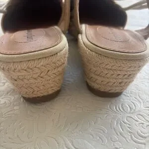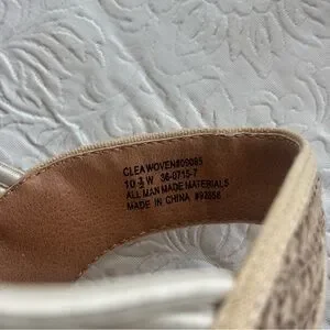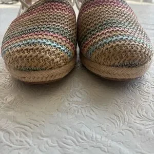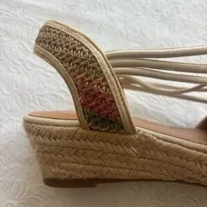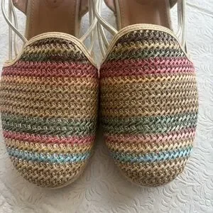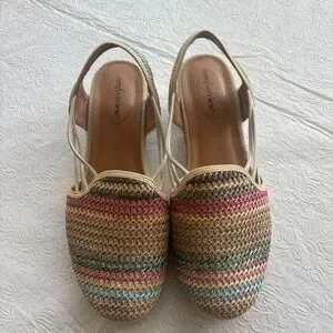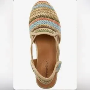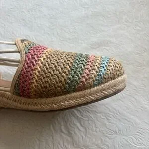 This style is a woven raffia-like wedge sandal designed for comfort, featuring elastic bungee straps and a padded insole. Braided multicolor upper with woven stripes. Tan espadrille wedge and trim. Elasticized slingback for easy slip-on wear. It also includes a skid-resistant, flexible outsole. Cushioned footbed for comfort. please note there will be variations in the print due to the individualized nature of the pattern