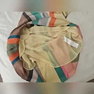 ZARA Multicolor Striped Spaghetti Strap Satin Top | SZ M - Flowy satin top in a stunning palette - butter yellow, pink, sage green, teal. V-neck, fully lined in yellow, V-back. Excellent Condition - loose stitches in seam under right arm (see last photo) - other than that it's perfect.
