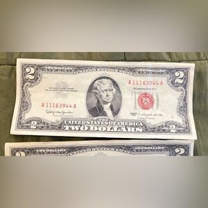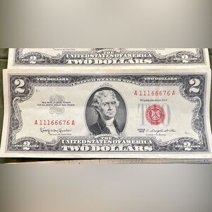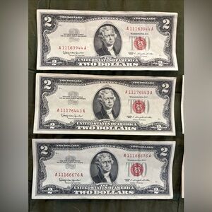 4 red stamp $2 dollar bills , 1963, circulated , 3 serial numbers begin with A 111… and are in excellent condition 1 serial number begins with A 043… and is in fair condition