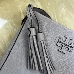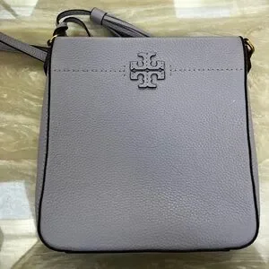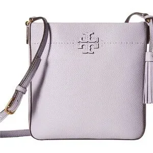 Compact lavender crossbody in pebbled leather. Features signature Tory Burch logo and tassel accent. Adjustable strap for hands-free wear. Clean, refined silhouette for daily use.