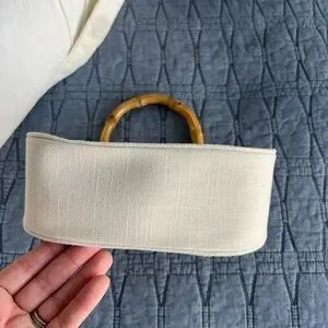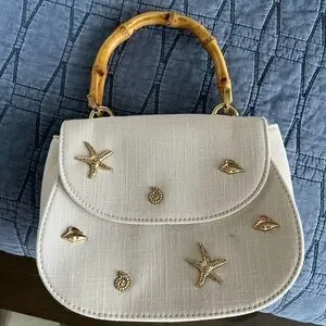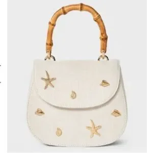 Chic cream mini bag with bamboo-style top handle. Gold-tone embroidered seashell and starfish accents. Compact, structured silhouette. Easy to pair with casual or dressy looks.