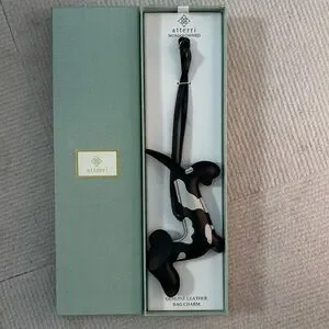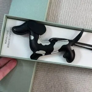 Genuine leather dachshund-shaped key and card holder. Sleek black base with cream patches for a stylish contrast. Lightweight and easy to carry on a bag or keys. Soft leather construction for durable everyday use.