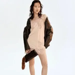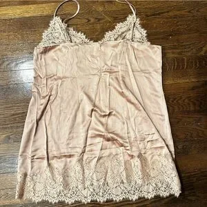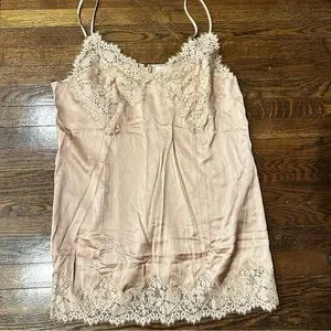 Delicate lace-trim slip mini in light beige. Thin spaghetti straps and soft drape. Feminine layer for day or night. Simple, elegant silhouette.