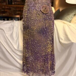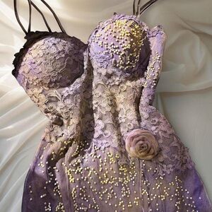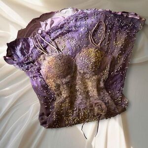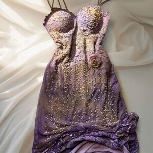 The craftsmanship is breathtaking: a specially mottled mesh overlay is hand-adorned with a galaxy of pale gold beads shimmering over intricate lavender lace for a moody layering of texture ~