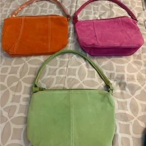 Stylish pink suede handbag with clean contrast stitching. Soft suede exterior in a vibrant pink hue. Versatile design that complements casual and dress looks. Lightweight and easy to carry for everyday use.