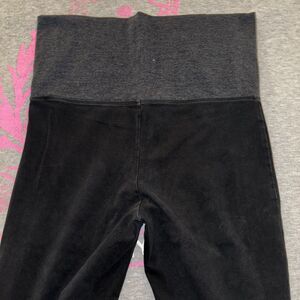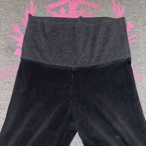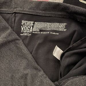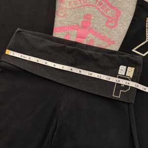 Black full length flare leggings with a dark charcoal gray foldover waist band with a silver and gold P logo. Giant hollow block pink logo on the bottom left leg in gold sequins.
