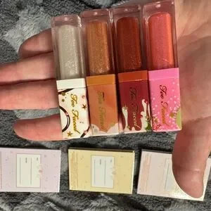 Too Faced lip glosses paired with three mini holiday themed palettes. Shades range from shimmering pinks and coral to warm gold and champagne. Easy to layer for glossy, festive looks.
