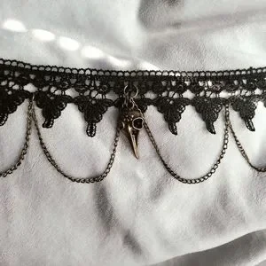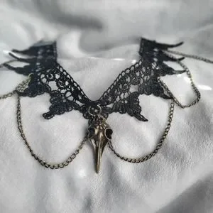 This stunning necklace features intricate black lace complemented by a striking gold skull pendant. Perfect for adding a touch of elegance and edge to any outfit.