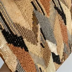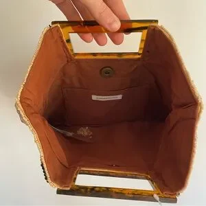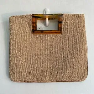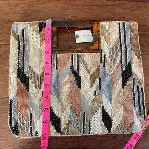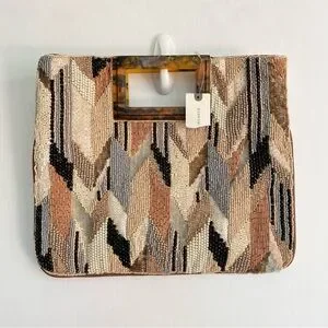 NWT Anthropologie Geometric Beaded Clutch in Beige Acrylic Handle Brown Black