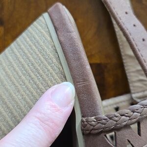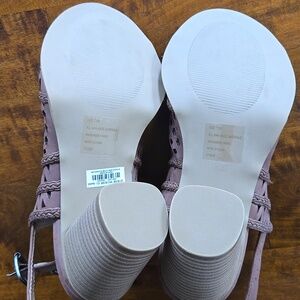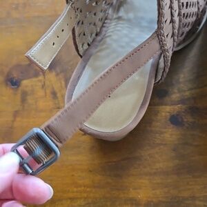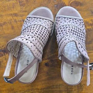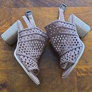 Torrid tan laser-cut block heeled sandals. Size 7.5 wide. Never worn, only tried on inside the house. these do not come with a box. Like new! The only call out is one shoe has a couple of indents on the edge of the faux suede that are barely noticeable and don't impact wear. Back ankle strap buckles. Faux wood heel. 3.5 inch heels.