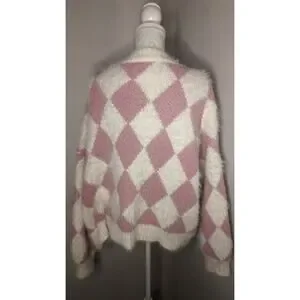 POL Argyle Fuzzy Cardigan Cozy Boutique Soft Girl Sweater Large