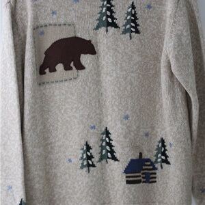 Cozy beige cardigan featuring nature motifs including trees and animals. Perfect for a casual, outdoorsy look.