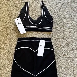 Sleek black sports bra with stylish white piping. Ideal for workouts or casual wear. Signature ALO Yoga design.