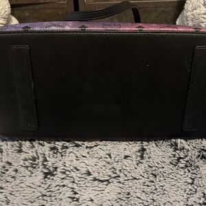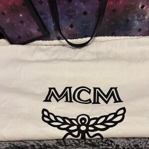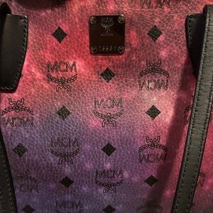 MCM tote in a pink-to-purple gradient coated canvas. Signature MCM logo pattern across the exterior. Black leather top handles for carry. Includes matching removable pouch. Versatile and eye-catching everyday tote.