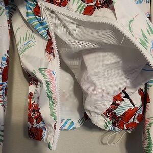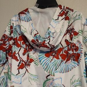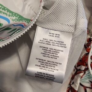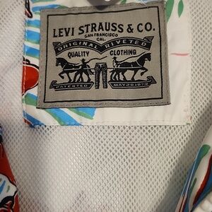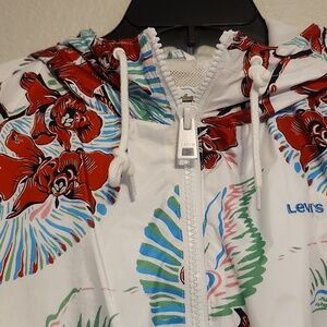 Chic Levi's ski jacket with vibrant red floral design. Features a white base with stylish accents. Perfect for winter sports and rain.