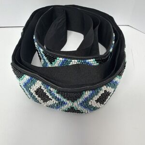 WHITE HOUSE BLACK MARKET Blue Black Green Glass Beaded Tie Belt M/L in really good condition. Please see pictures for details. The product is a stylish and colorful Blue Black Green Glass Beaded Tie Belt by White House Black Market, designed in a size M/L for women who wear regular size belts. The belt features a unique tie accent and is made of beaded material, making it a fashionable and eye-catching accessory for any outfit. Perfect for adding a pop of color and personality to a wardrobe, this belt is a versatile piece that can elevate any ensemble with its colorful design and trendy style.
