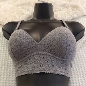 Victoria's Secret lace padded bra in soft gray. The lace is soft, stretchy and comfortable. Can be worn causally with an open top or without.