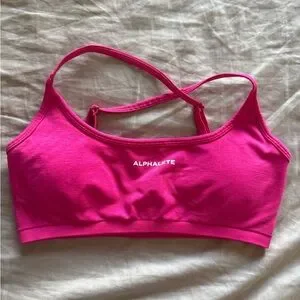 Stylish and comfortable sports bra. Features a vibrant pink color and adjustable straps.