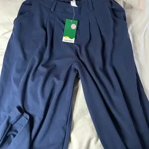 Flowy wide-leg trousers with a high waist and belt loops. Deep side pockets for practical storage. Smooth drapey fabric for easy movement. Clean navy color pairs with casual or dressy looks. Ran bigger than expected
