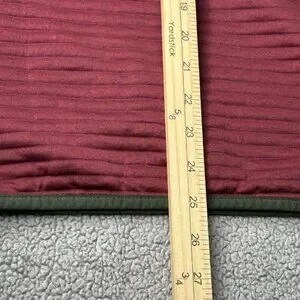 Color: Dark red (burgundy) body with dark green trim at the collar, snap placket, and sleeve cuffs.