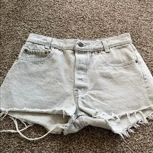 Stylish Levi's jean shorts. Light gray color. Frayed hem design. Perfect for casual wear.