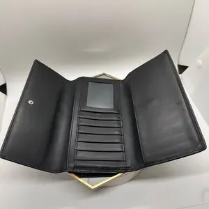 Coach foldover clutch in signature canvas. Elegant black pattern with contrast stitching. Clean, refined silhouette for every day use.