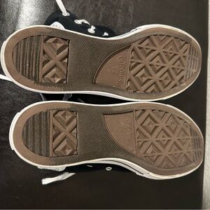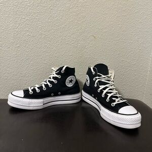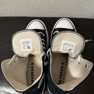 Black high-top Converse sneakers. Marked size 6.5 on the sole and 8.5 on the label; fits like a women’s 8.5. Used but in great condition. Slight fading on the black canvas from normal wear. Clean white rubber and laces. As pictured.
