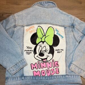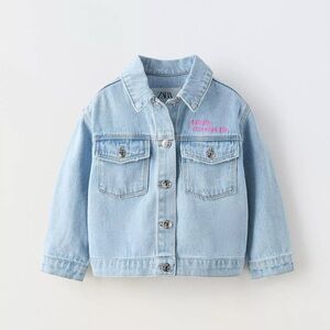Light blue denim jacket by Zara. Button-front closure with chest flap pockets. Pink embroidered lettering adds a playful accent. Classic collar and long sleeves. Easy to layer over tees and sweaters.