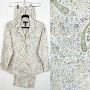 Women's lounge sleepwear, Lauren Ralph Lauren, LRL, women's pajama set, paisley print, pastel floral, button-up top, elastic waist pants, soft lounge wear, luxury sleepwear, embroidered RL monogram, cottagecore, romantic vintage, cozy chic, elegant loungewear, lightweight fabric, spring pajamas, feminine comfort, quiet luxury, soft glam, dreamy neutrals, giftable sleep set, classic Ralph Lauren